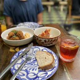 Gorgeous backyard seating, but beware of mosquitos in late August! We came for the smoked spaghetti aglio olio and it exceeded expectations! We loved all our appetizers - croquette special (oxtail ragu pasta filling), broccolini, polipo (cooked to perfection and not at all chewy). But the star was the stracciatella which paired beautifully with the complimentary focaccia (I had to force myself to stop eating it to save room for the entrees). For entrees, the smoked spaghetti was the star and it was surprisingly not too smoky (for context, I don't typically like mezcal but I do love bacon). Meanwhile, I thought the eggplant ravioli and sausage orecchiette were good but paled in comparison to the smoked spaghetti. We loved the variety and creativity of the drinks, but the tomato melon sorbet with olive oil dessert really shone through with its unique combination of ingredients. While it's hard to say if it's objectively a perfect dessert, I could not stop eating bite after bite, so that says something!